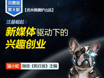 猛小蛇 新媒体驱动下的兴趣创业 猛小蛇 微信《狗日报》主编 前盛大切客运营副总监 猛小蛇(严文波),微信《狗日报》主编,曾任Myspace中国运营总监,华为互联网部社区运营总监,盛大切客运营副总裁。 课程介绍 微播炉 微信 微营销 新媒体兴趣创业,经验之谈:定方向选好名,产品身上选平台;抓热点快营销,内容服务都重要;慢发展细规划,照片视频商业化。创业并不难,选择到正确的方向,坚持做到最好,走下去成功就在前方。 课时1狗日报的价值与定位(4分钟) 课时2狗日报运营十大经验(上)(16分钟) 2.1选好方向 兴趣创业 2.2好名字是成功的一半 2.3根据产品的定位选择合适的平台 2.4粉丝增长几道坎 2.5如何筛选高质量用户 课时3狗日报运营十大经验(下)(12分钟) 3.1抓热点 快营销 3.2多元素商业化 3.3内容是基础 服务是王道 3.4增加曝光率的两个手段 3.5慢发展 细规划 课时4宠物服务行业未来前景(10分钟) 课时5成功玩转的线上营销(5分钟) 5.1第一次成功的卖货 5.2第一次成功的营销 5.3微社区可以自给自足 |